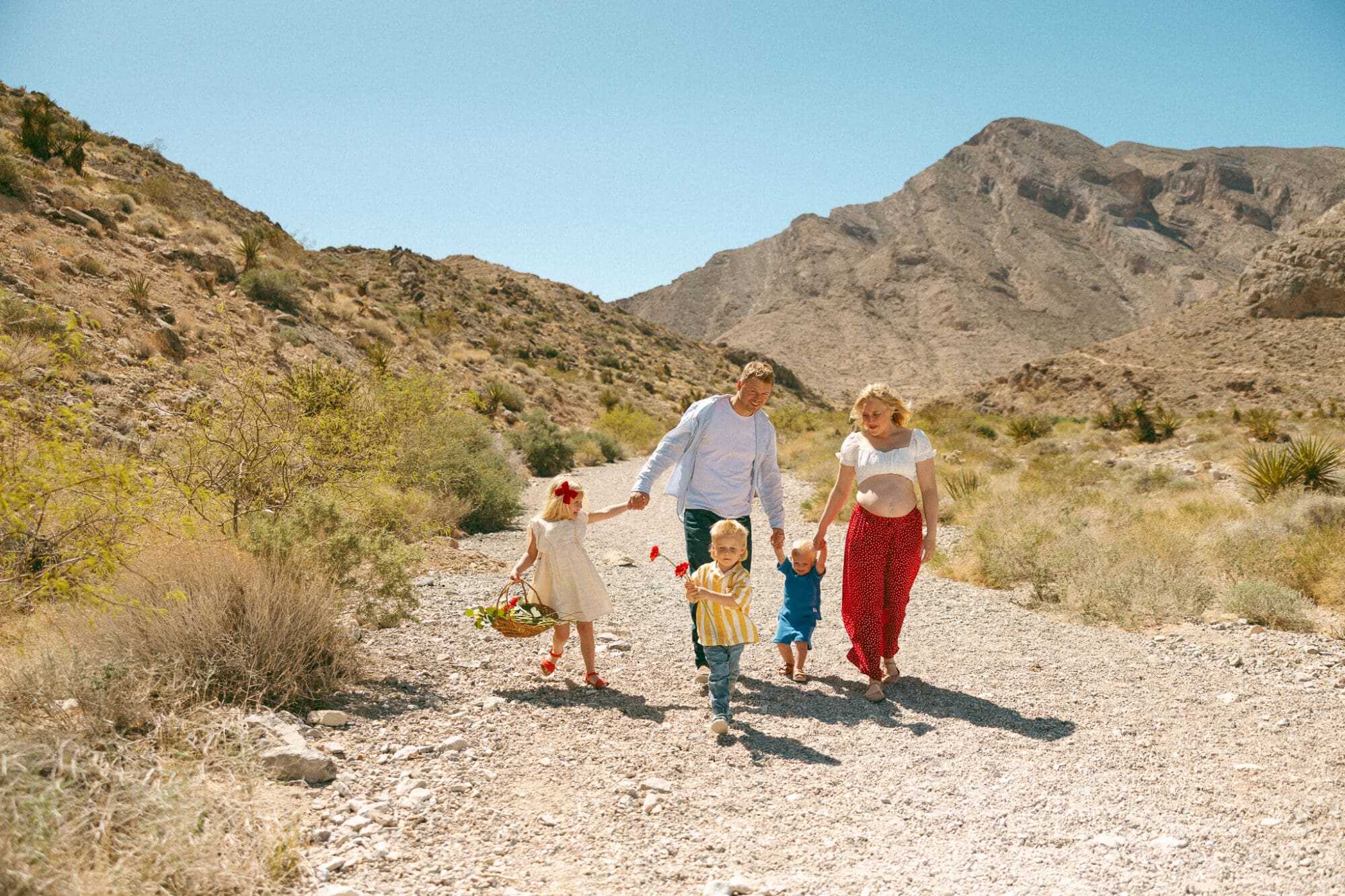 Light, breathable fabrics. Even at golden hour in Las Vegas, it is warm. Linen and cotton photograph beautifully and keep your family comfortable so the photos feel relaxed.