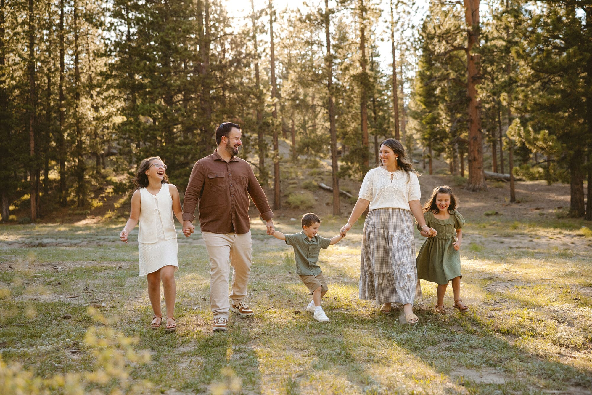 Denim midi dresses, sage ruffle tops, simple linen sets for the boys, smocked floral dresses for girls. The key is still the same: coordinate without matching, keep the palette cohesive, and prioritize comfort so everyone can actually move.
